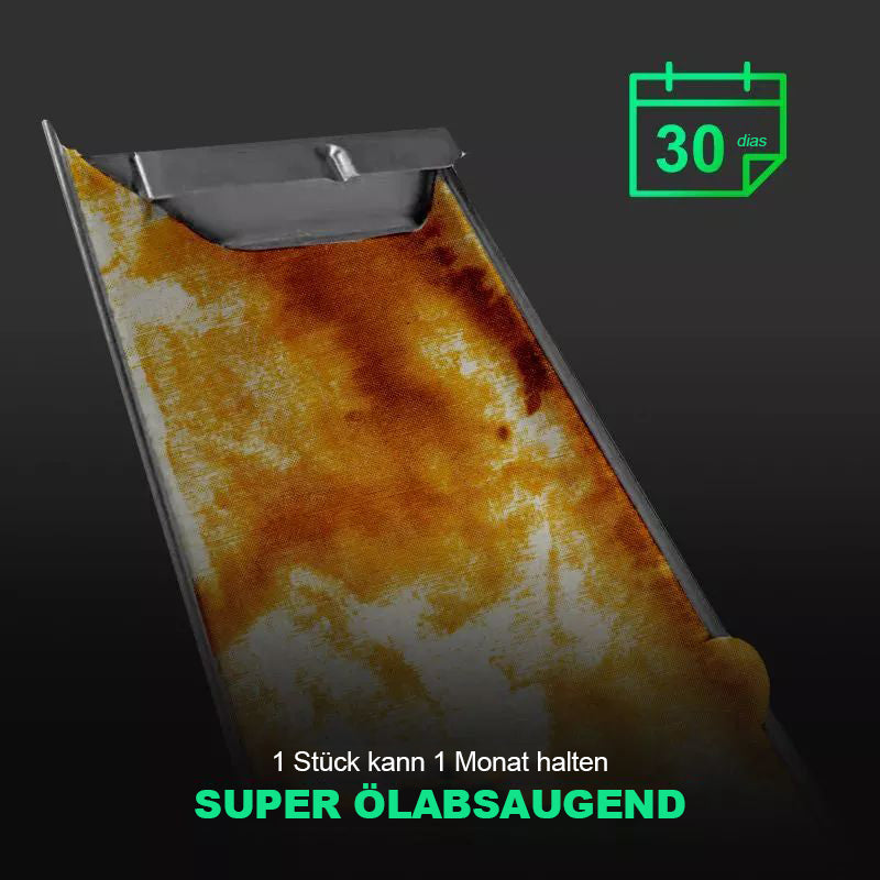 • Super-Ölabsorber Super-Ölabsorber, absorbiert schnell und einfach Öl, Flüssigkeiten auf Ölbasis und Fette. Ein Stück Fettfilterpapier reicht für einen Monat. Der Fettabscheider der Haube muss nicht gereinigt werden.