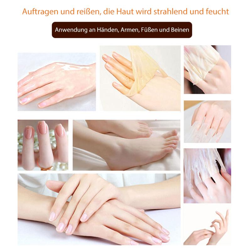 2. Auf die gesamte Hand auftragen, insbesondere auf die Gelenke und Fingerspitzen, und 15-20 Minuten warten, bis das Wachs eine Maske bildet