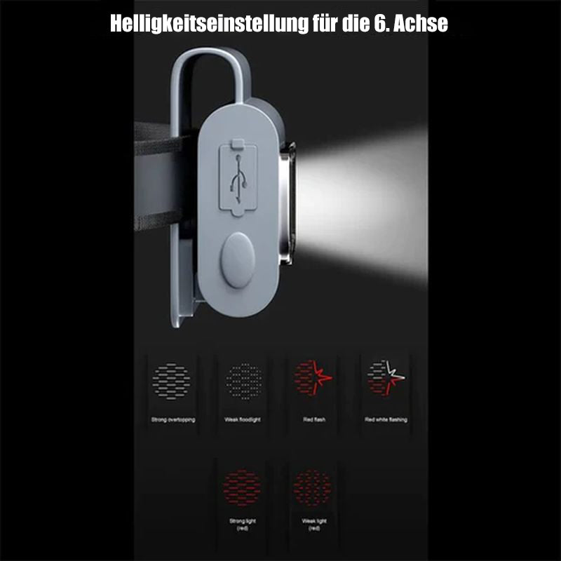 - 6 Schalter : starkes weißes Licht – schwaches Licht, weißes Licht blinkendes rotes Licht – doppeltes blinkendes rotes/weißes Licht – helles Rot – schwaches Licht rot