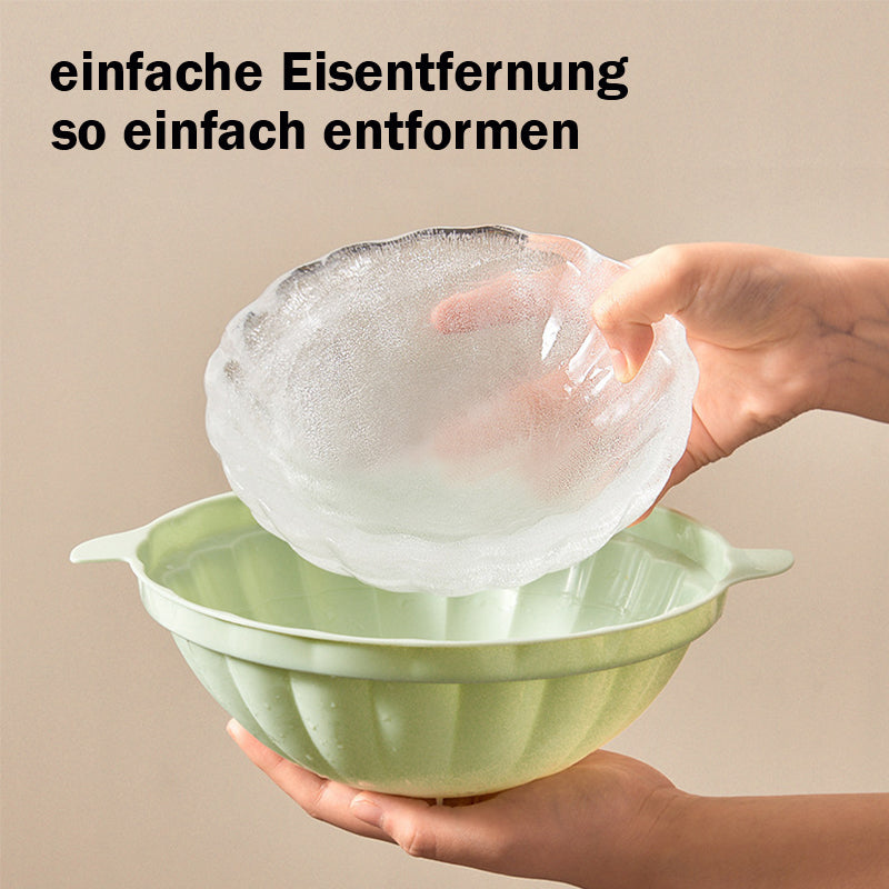 Um die Eisschale herzustellen, müssen Sie Wasser in die Eisschaleform gießen, zuerst am Wasserstand anhalten und es dann 24 Stunden lang in den Kühlschrank stellen, um es einzufrieren. Sie werden feststellen, dass es einfach ist, die Eisschale aus der Antihaft-PP-Form zu entfernen, sie gleitet wie Butter ab, wenn Sie die Form drücken. Mit einfacher Bedienung werden Eisbecher aus Glas hergestellt und das Essen gekühlt.