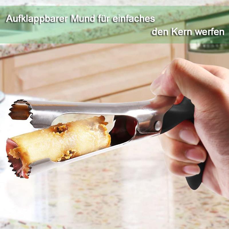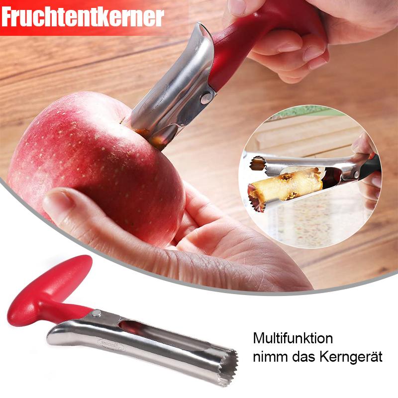 • Einfach zu verwenden. Ergonomischer ABS-Griff zum mühelosen Drehen oder Schieben des Entkerners durch Äpfel, Birnen usw.