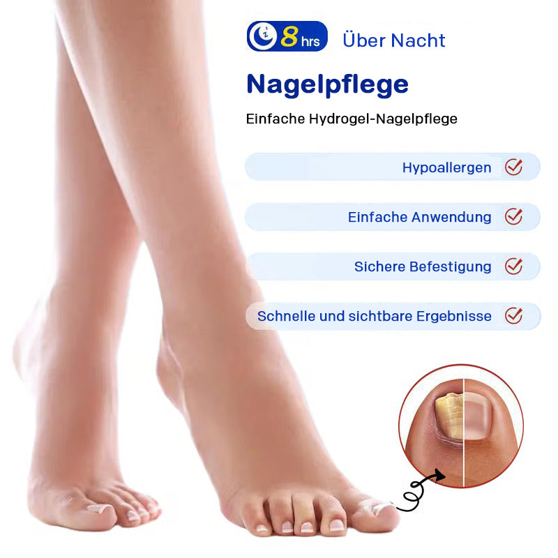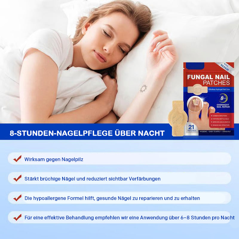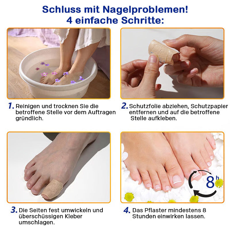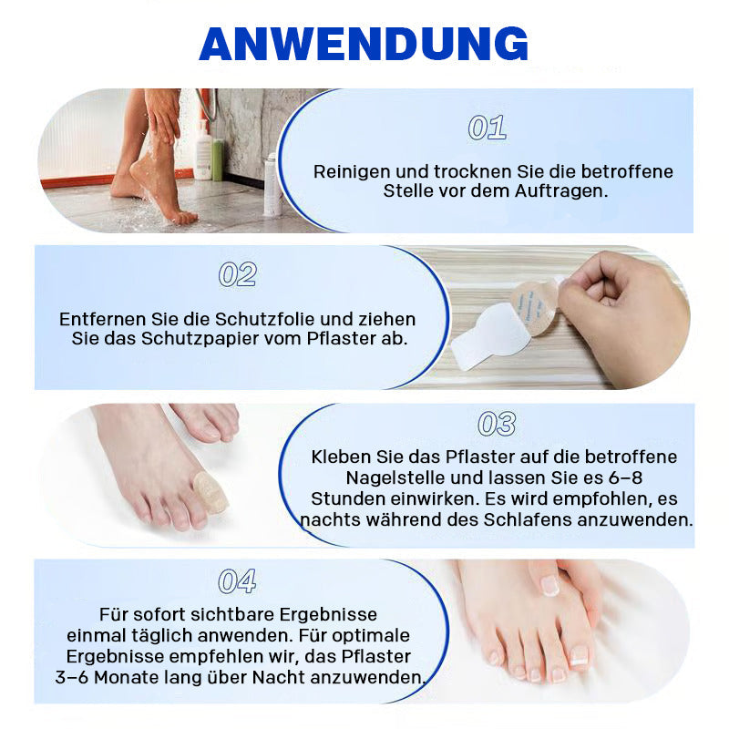 Langanhaltende Ergebnisse bei regelmäßiger Anwendung: Für langanhaltende Ergebnisse täglich vor dem Schlafengehen ein Pflaster auftragen und 6–8 Stunden auf den Nägeln lassen. Bei regelmäßiger Anwendung über 3–6 Monate erhalten die Nägel ihre natürliche Stärke und Klarheit zurück.