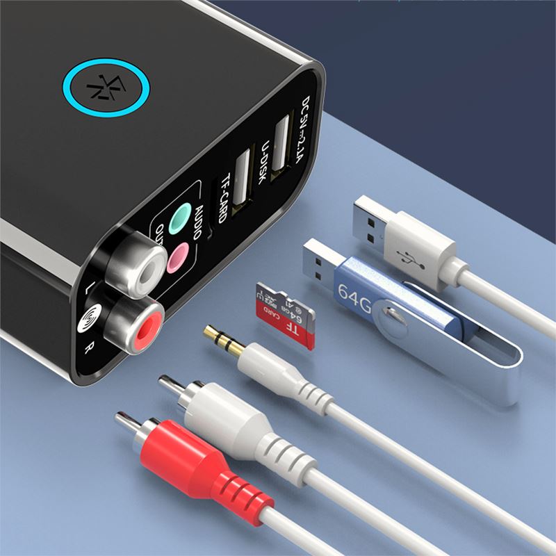 • Kommt mit 2 USB-Anschlüssen, 1 MicroSD-Kartensteckplatz, 1 Audioeingangs-/Ausgangsbuchse und linken/rechten Cinch-Buchsen