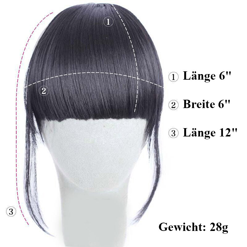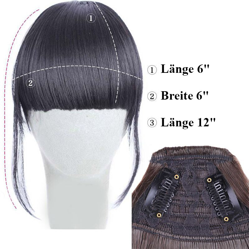- Bangs Color & Style: Der kürzere Bereich (die Mitte) ist 6 Zoll, die Haarbügel auf beiden Seiten sind 12 Zoll. Dicker und voller französischer Pony-Stil, die Haarbügel auf beiden Seiten können unterschiedliche Gesichtskonturen korrigieren. Je nach Schnitt kann es etwas dünn oder stumpf sein. Sie können es mit der Schere oder dem Lockenstab neu stylen, es wird nicht empfohlen, mehr als 230 ℉ zu gehen.