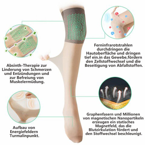 Lange Seidensocken zur Ionenkorrektur und Lymphentgiftung verfügen über eine innovative Technologie mit Graphenfasern. Diese Fasern fördern die Zellregeneration und verbessern die Nervenfunktion, lindern Knieschmerzen und unterstützen den Knochenerhalt. Darüber hinaus enthalten die Socken Millionen magnetischer Nanopartikel, die ein statisches Magnetfeld erzeugen und so die Durchblutung und Muskelentspannung fördern. Die Verwendung von Wermut verstärkt zudem die Wirksamkeit dieses statischen Magnetfeldes. Durch die Kombination dieser beiden Technologien sorgen Socken für eine allgemeine Kniegesundheit und eine verbesserte Beinunterstützung.