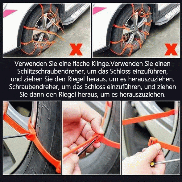 Schnelle Installation, ohne dass das Fahrzeug bewegt oder die Reifen abgenommen werden müssen, einfach für Männer und Frauen.