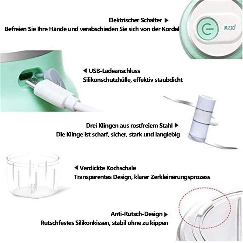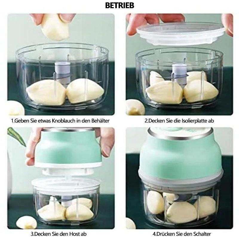 • [Great Kitchen Helper] Unser elektrischer Lebensmittelhacker ist mit 3 verstärkten Klingen ausgestattet. Er hilft Ihnen nicht nur beim Hacken von Knoblauch, Ingwer, Paprika, Gemüse, Obst. Sie sparen Zeit und Mühe.